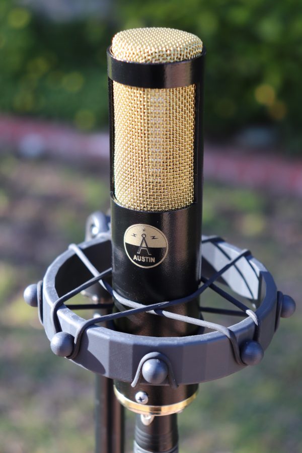 BLACKMIC is the Austin Model-1 Ribbon Microphone with a black matte, laser-engraved, powder-coated microphone body and a dual-layer brass grille. NOS 1970’s Switchcraft XLR connector (silver contacts), neodymium magnets, figure-8 passive ribbon polar pattern, and 3D printed elastic shockmount.